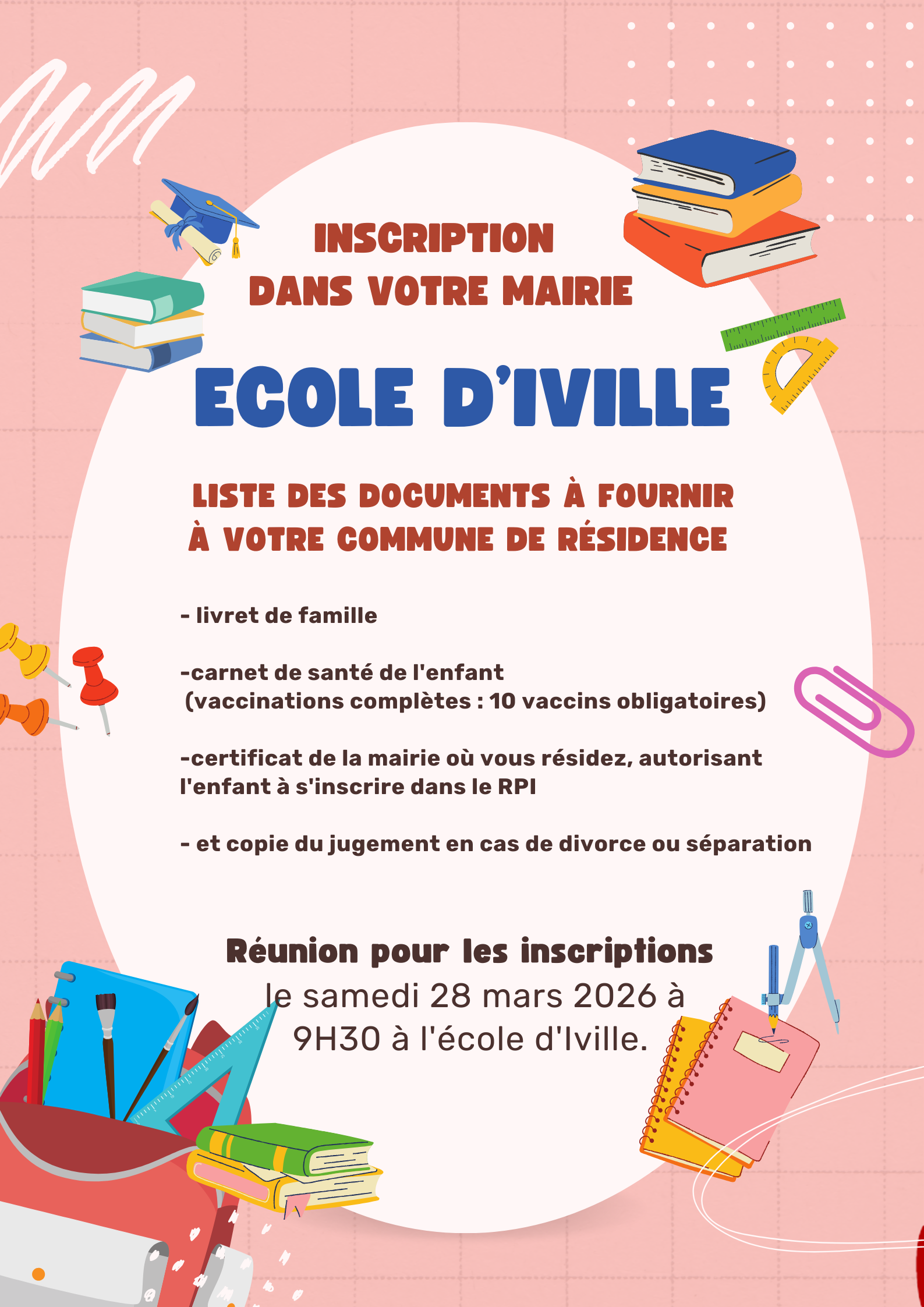 Les parents sont invités à inscrire leurs enfants à l’école d’Iville en mairie, en vue de la prochaine rentrée.