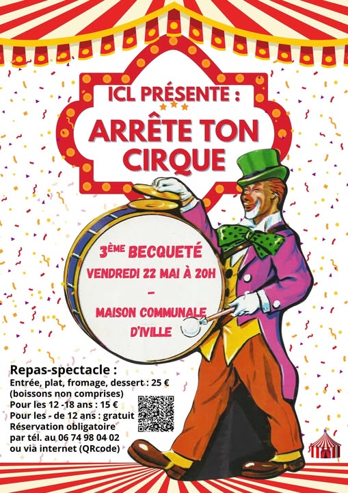 La troupe d’ICL (Iville Culture Loisirs) propose une nouvelle “becquetée sur le thème du cirque, vendredi 22 mai 2026 à 20h à la maison communale.